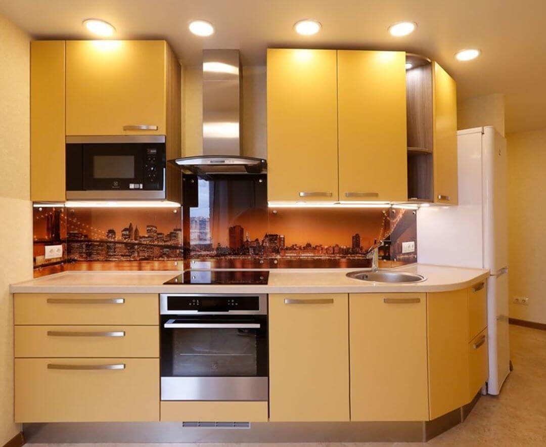 В качестве акцента установите яркий фартук для желтой кухни. Это может быть классическая цветная плитка или плита «кабанчик». Особенно оригинально будет выглядеть скинали – закаленное стекло с подложкой. Этим дизайнерским решением можно не только сделать цветовой акцент, но и разнообразить монохромность кухонного пространства ярким рисунком.
