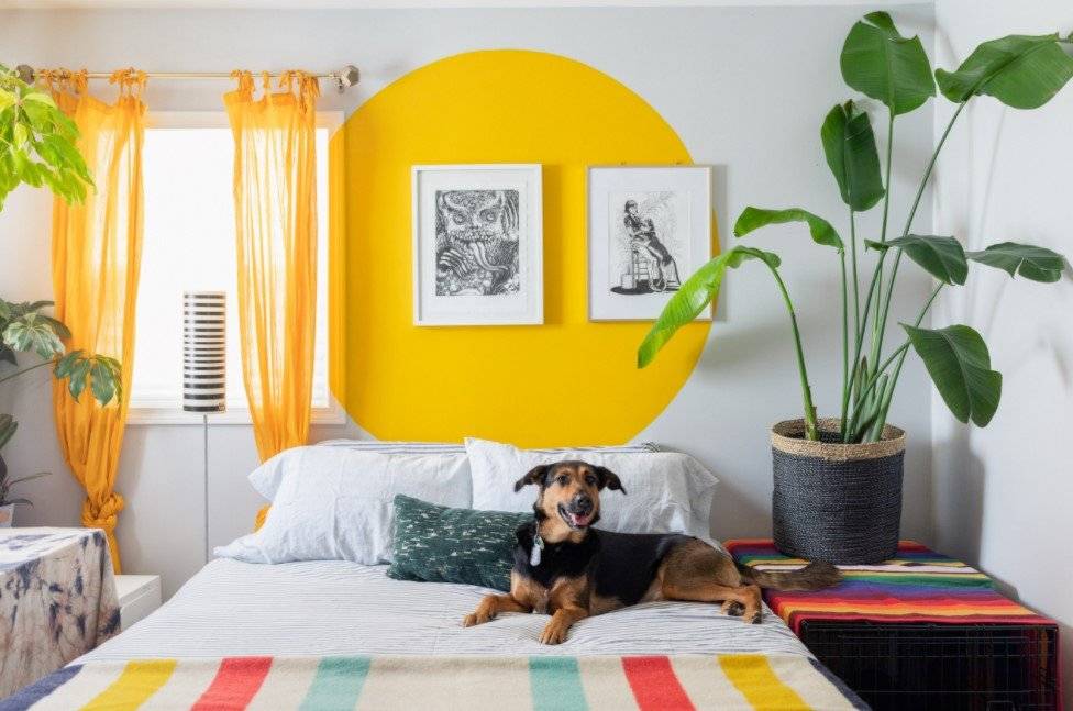 Сделать спальню солнечной поможет стена, выкрашенная в ярко-желтый цвет. Конечно, все поверхности покрывать таким насыщенным оттенком не стоит. Другие элементы должны иметь более приглушенный тон, тогда отделка станет более интересной, но при этом от нее не будут уставать глаза.