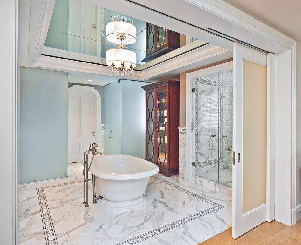 - Эстетичность. Так как зеркала сами по себе становятся элементом декора, их можно оставить в неизменном виде либо использовать дополнительные средства украшения, такие, как аэрография, создав витражный потолок в ванную.