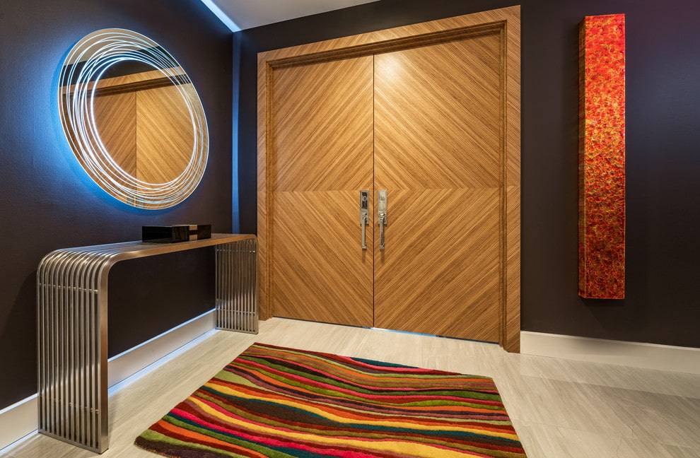 - Такие двери гармонируют с любой мебелью в прихожей. Чаще всего приобретают панели из ясеня, беленого дуба или венге.