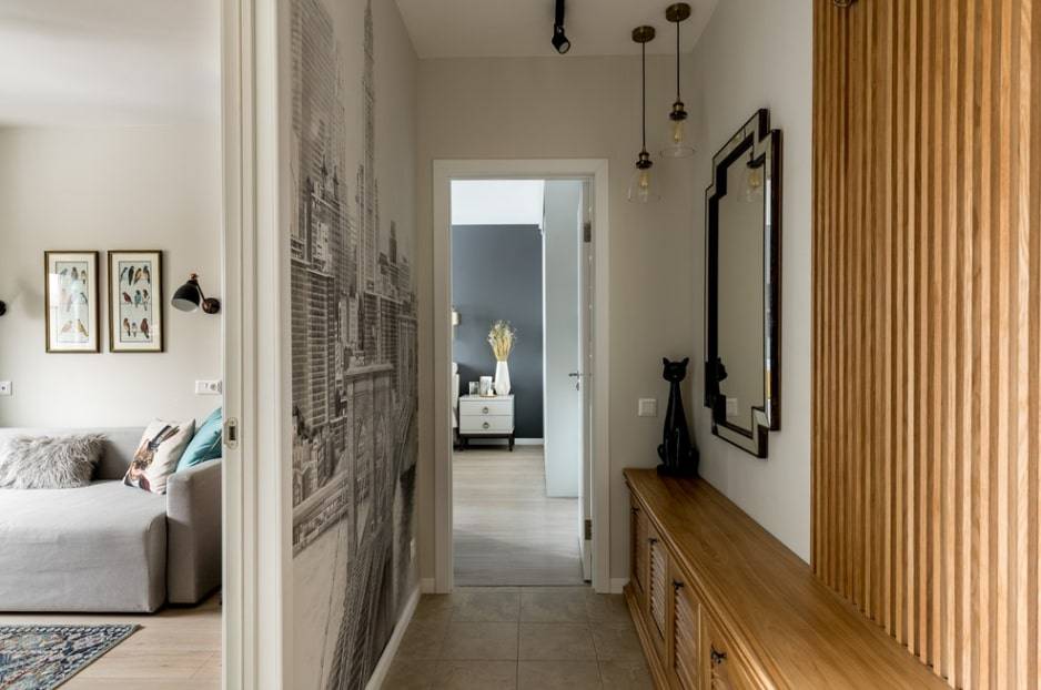 - Визуально стены раздвигаются, поэтому обустроим по-новому пространство в прихожей и коридоре.