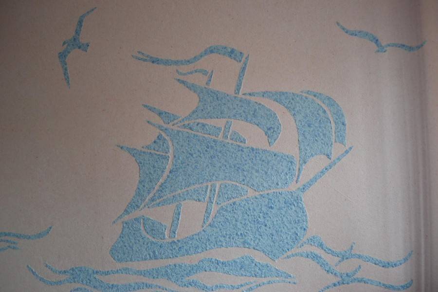 К тому же пользоваться трафаретом можно и проще: очертить границы рисунка, заполнить контуры жидкими обоями, срезая лишнее шпателем или ножом.