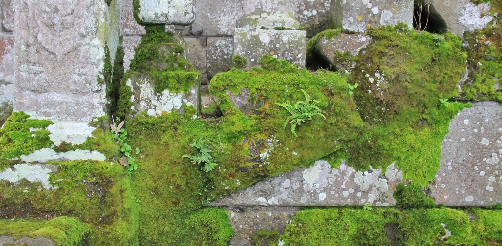 Стену из камня можно украсить с помощью мха