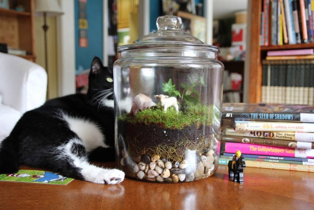 Выбирайте сразу тот флорариум, который хотите видеть в качестве постоянного. Мох растёт довольно медленно, долго остаётся компактным, и пересаживать его в ёмкость побольше придётся в лучшем случае года через два-три. Емкость необходимо тщательно вымыть, насухо вытереть, а потом сполоснуть изнутри дистиллированной водой.