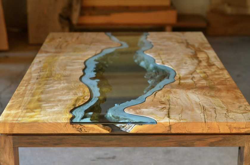 После застывания смолы, столешница шлифуется и покрывается прозрачным полиуретановым лаком.