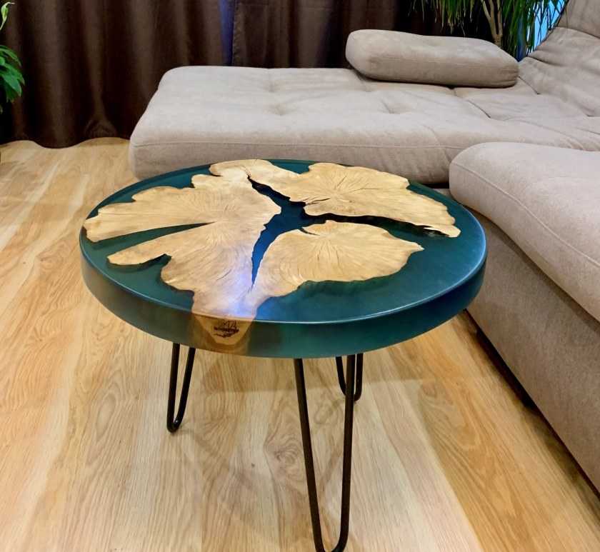 Красивый журнальный столик своими руками из дерева получается из фактурной доски с дефектами в виде глубоких трещин, если их заполнить разноцветной эпоксидной смолой.